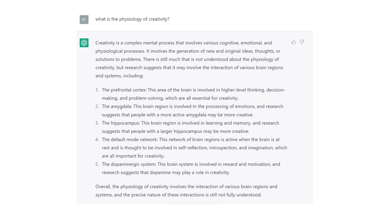 As an interesting test, Figure 6 (below) is a screen shot of the ChatGPT response to the question, “What is the physiology of creativity?” The focus of the response is activity in the human brain reflective of how ChatGPT was trained. This in itself is not creativity. Rather, it is imitation. Recall, current work in artificial intelligence sits at an imitation barrier (Chen, et.al., 2020).