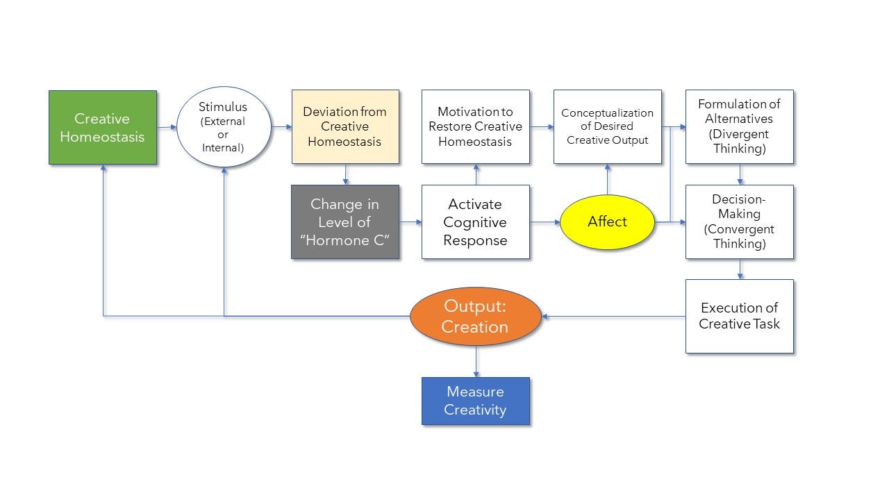 The paradigm suggested to guide the work is one of a physiological system for creativity. A key hypothesis is the existence of creative homeostasis in which there is no motivation to create. Homeostasis of one form or another is the steady-state all physiological systems strive to maintain. Creative homeostasis is the steady-state a body requires in its internal environment to support a non-creative state. A stimulus, external or internal, drives the body away from creative homeostasis. The motivation to create emerges. A physiological creativity system framework appears in Figure 2.