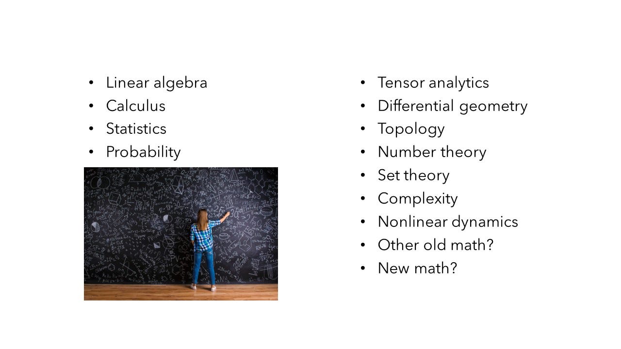 Once the physiological creativity system is modeled in vivo, the mathematics required for artificially reproducing that system’s behavior requires discovery. Current math used in a neural network paradigm include linear algebra, multi-variate calculus, statistics, and probability. A whole set of other math to test exists that might or might not prove useful in the pursuit of true ACI. Other disciplines of math include, among others, tensor calculus, differential geometry, topology, number theory, set theory, chaos theory, quantum theory, and nonlinear dynamics (Figure 4). Once proper mathematics are applied, ACI can be simulated in vitro and be ready for experimentation in machine creativity.